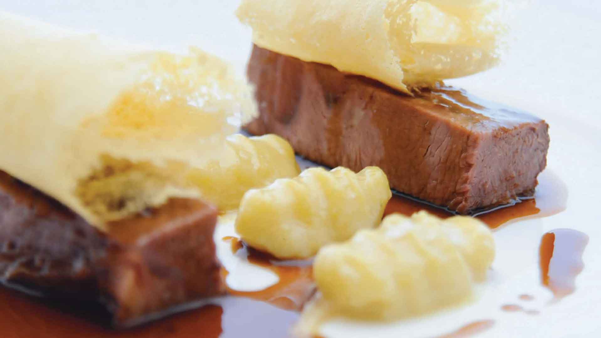 Serve the chuck, coat it in the Mondeuse sauce, and add the gnocchi and parmesan lace.