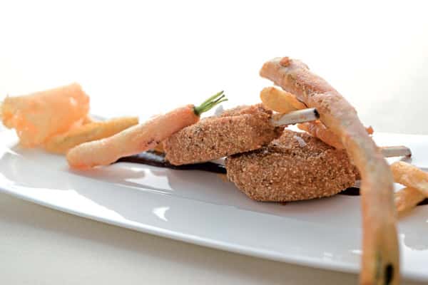 Breaded rack of lamb, sage fritters and vegetable tempura recipe