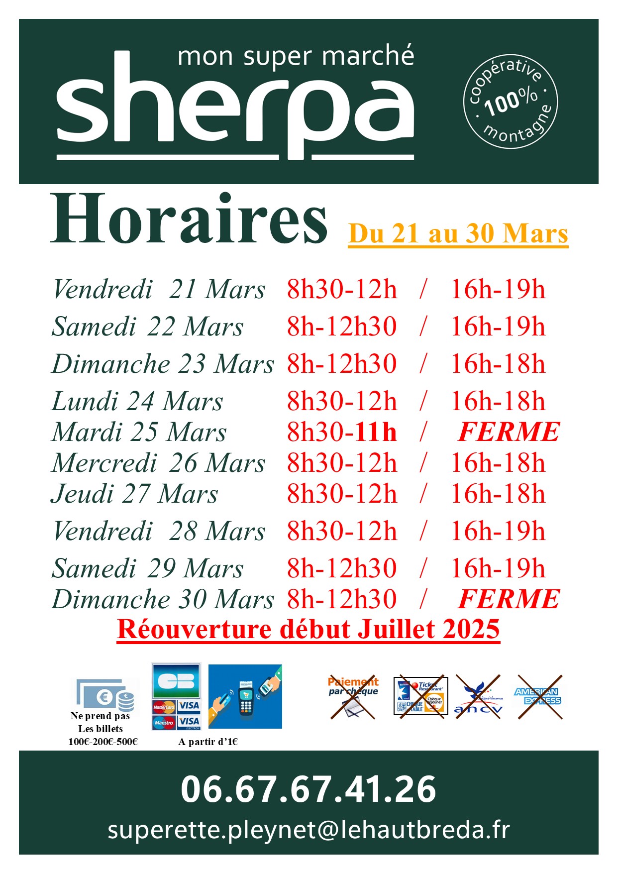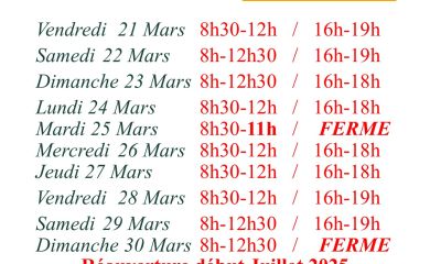 Opening times: from Dec., 20th to April, 10th 08h00-12h30 / 15h30-19h30